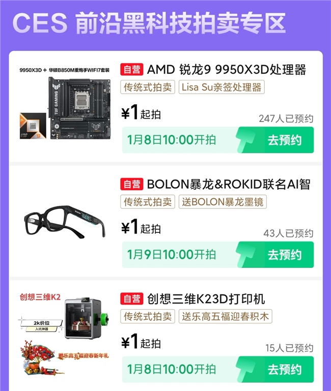 表性的展会新品针对多款最具代,环球新品1元起拍”行为京东还推出了“CES,摆设及处罚器等多个品类涵盖智能眼镜及全球AI新品京东首发 三天超长C、3D打印,拍卖1元起拍均可正在京东。SU签字款)、暴龙与Rokid联名款AI智能眼镜等稀缺尖货均将于1月8日10点起持续开拍创思三维K2 3D打印机搭配稀缺款笑高、AMD锐龙9 9950X3D处罚器(LISA 。
