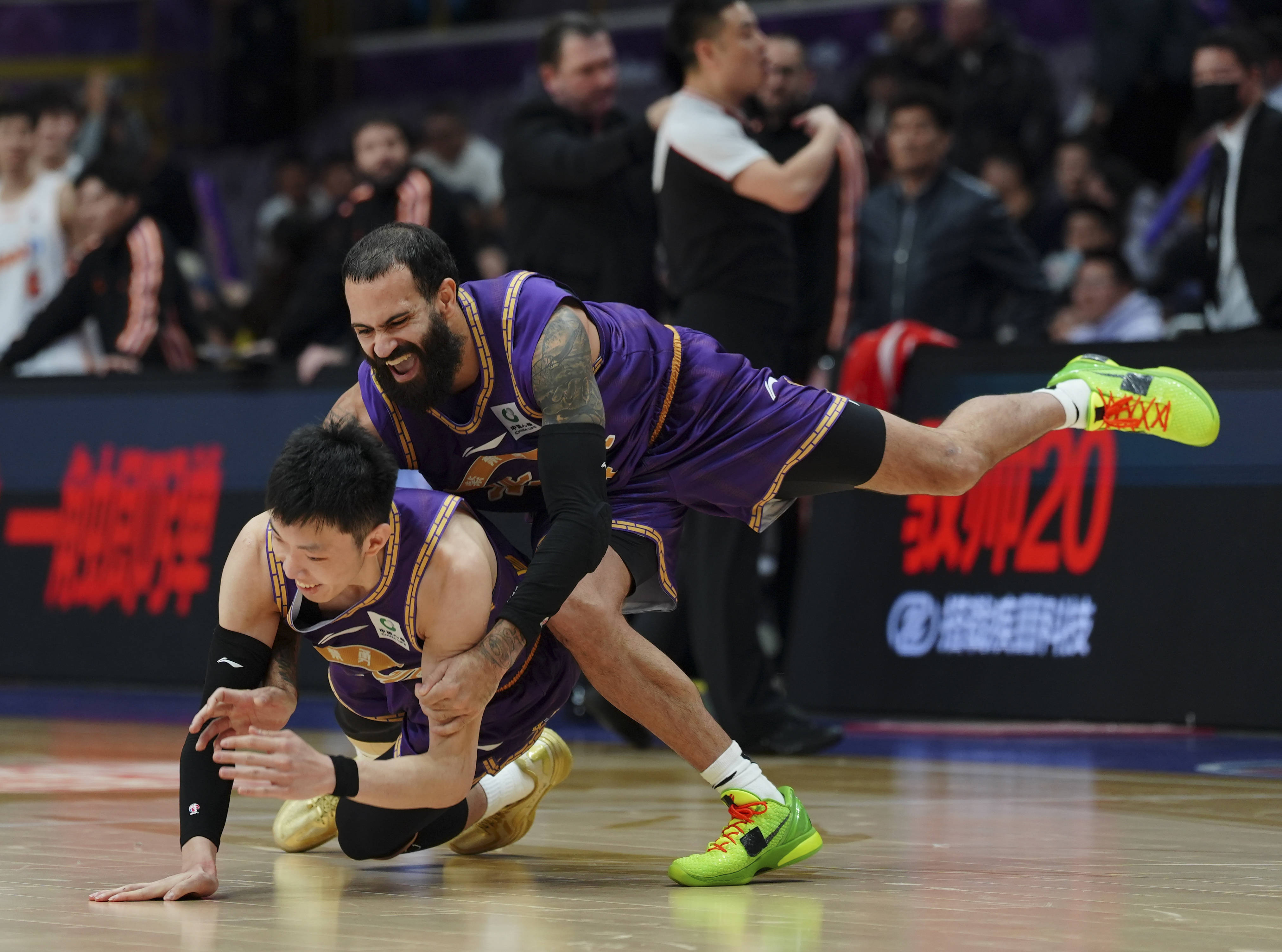 12日1月亚星代理平台中绝杀三分球后与队友里勒致贺北京控股队球员廖三宁(左)投亚星代理平台者 谢晗 新华社记摄