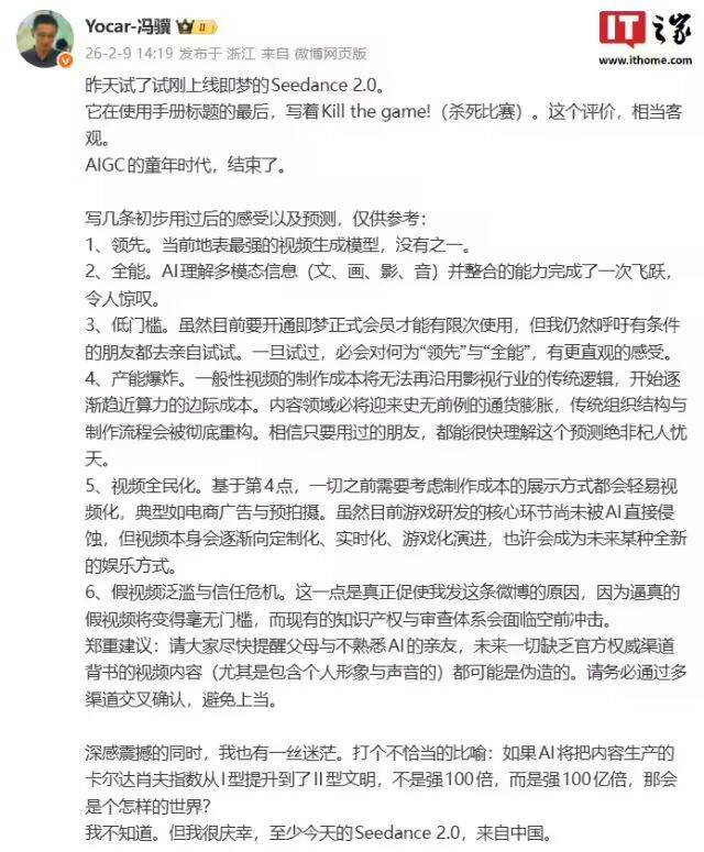 即梦 Seedance 2.0:AIGC 的童年时间(讯息出处:IT之家)《黑神话:悟空》创造人冯骥讲,束结了